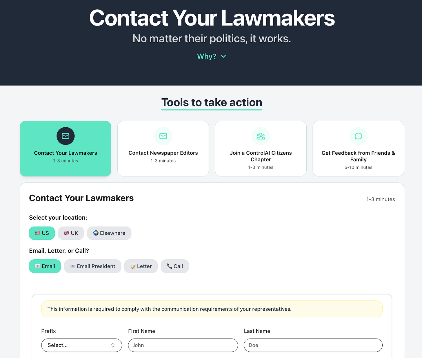 To do this, we’ve built contact tools that make it super easy to get in touch with your representatives; it takes just around a minute to complete the entire process. Try them out and let politicians know how important this issue is to you!