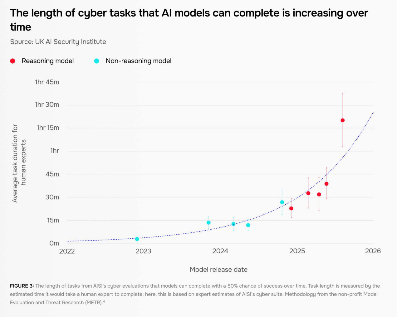 Meanwhile, AISI finds that the length of cyberthreat-relevant tasks that AIs can do is growing exponentially, doubling around every 8 months.
