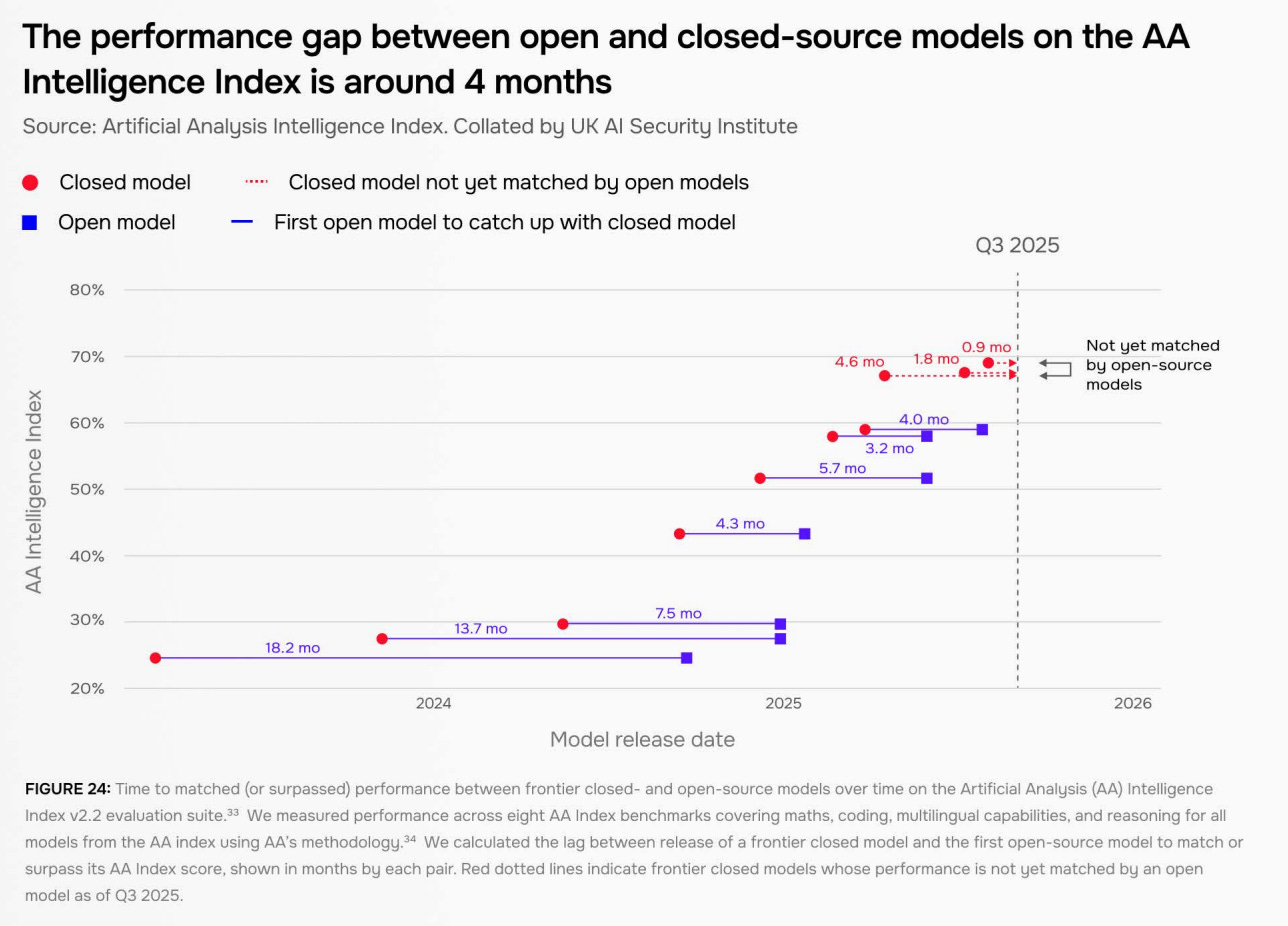While the best open-source AIs are less capable than the best proprietary AIs, this gap is closing. AISI says it has narrowed over the last two years and is now down to somewhere between 4 and 8 months.