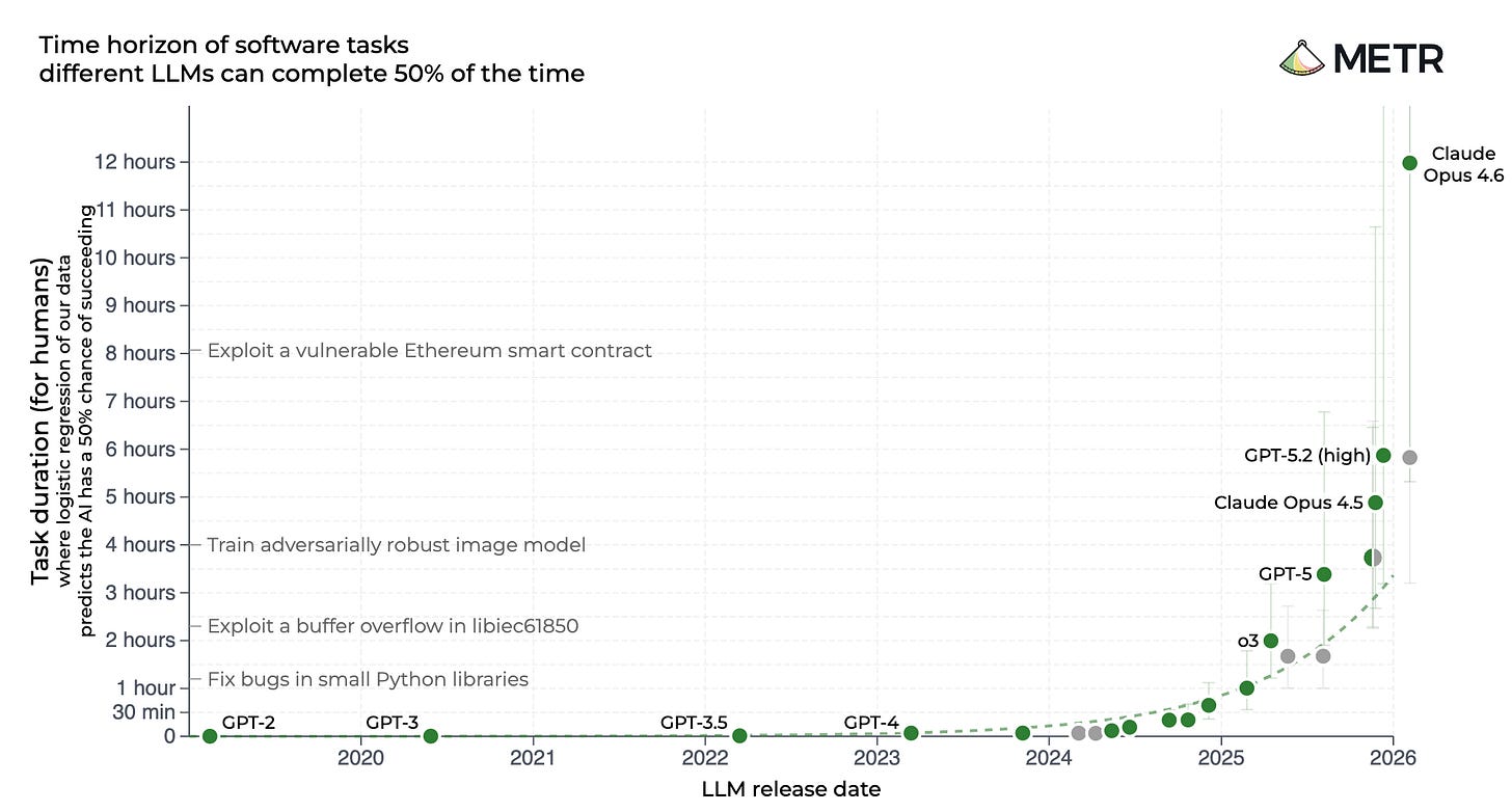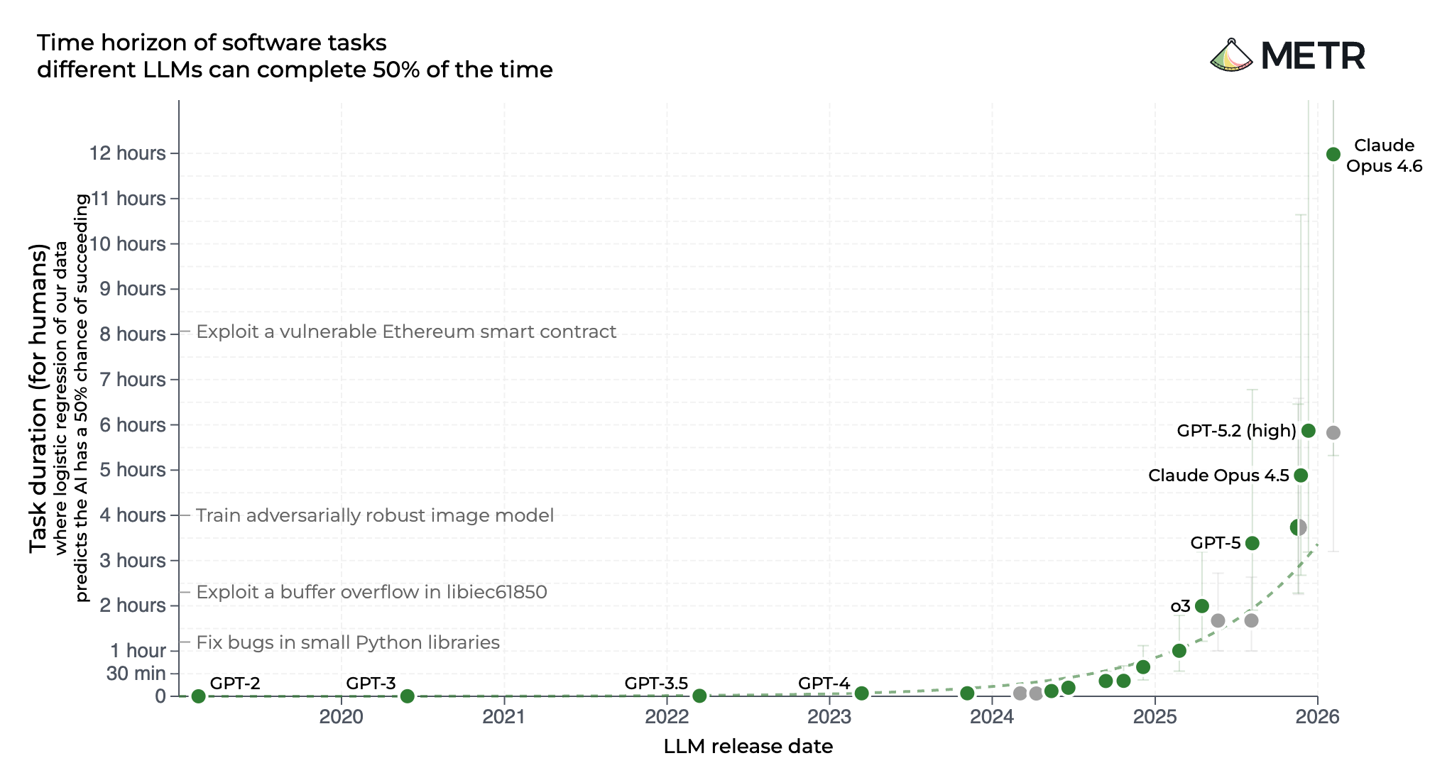 We last wrote about time horizons when OpenAI released ChatGPT-5, which had a time horizon of 2 hours and 15 minutes. Now METR have tested Anthropic’s Claude Opus 4.6, and it’s 12 hours. This is a drastic increase, but it’s not unexpected. With the release of reasoning models in late 2024, a new trend has emerged, where AI’s time horizons aren’t doubling every 7 months; they’re now doubling every 4 months. Claude’s result tracks with this trend.